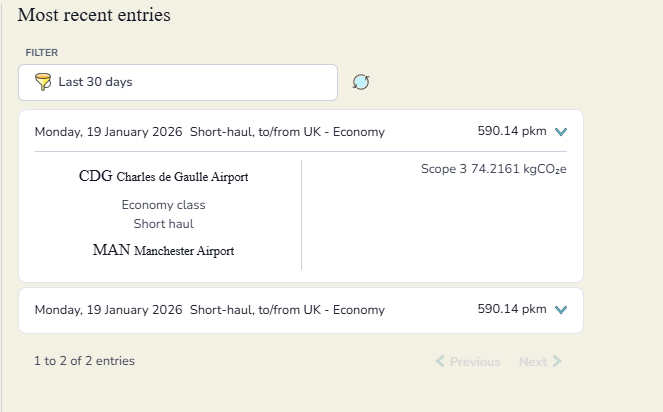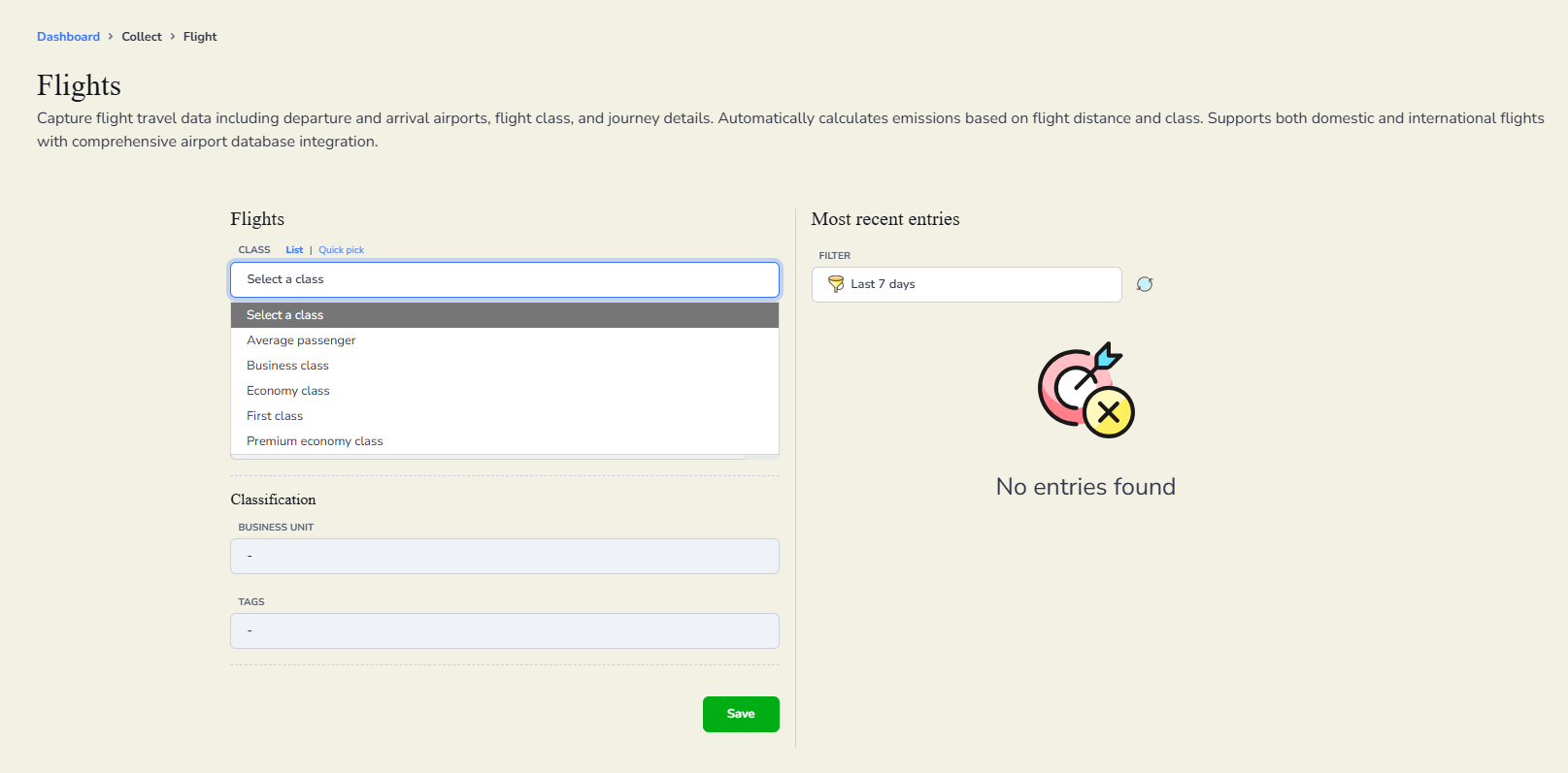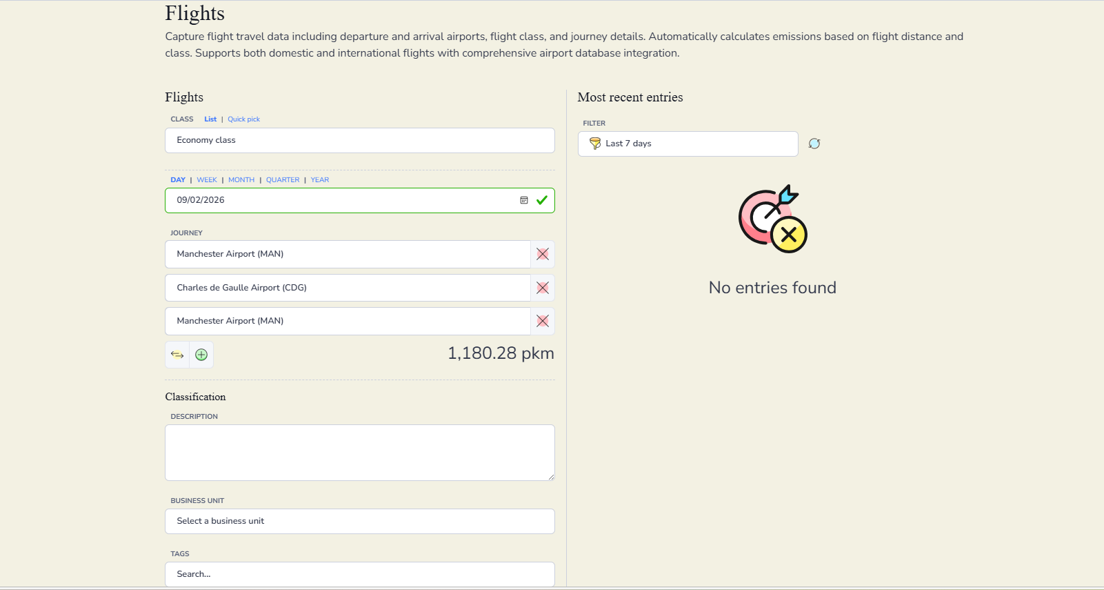 If you travel by air for business purposes, please record your flight details under Business Travel by selecting Flights and choosing the cabin class you travelled in. If you are entering historical data or are unsure which cabin class was used, please select Average Passenger.
