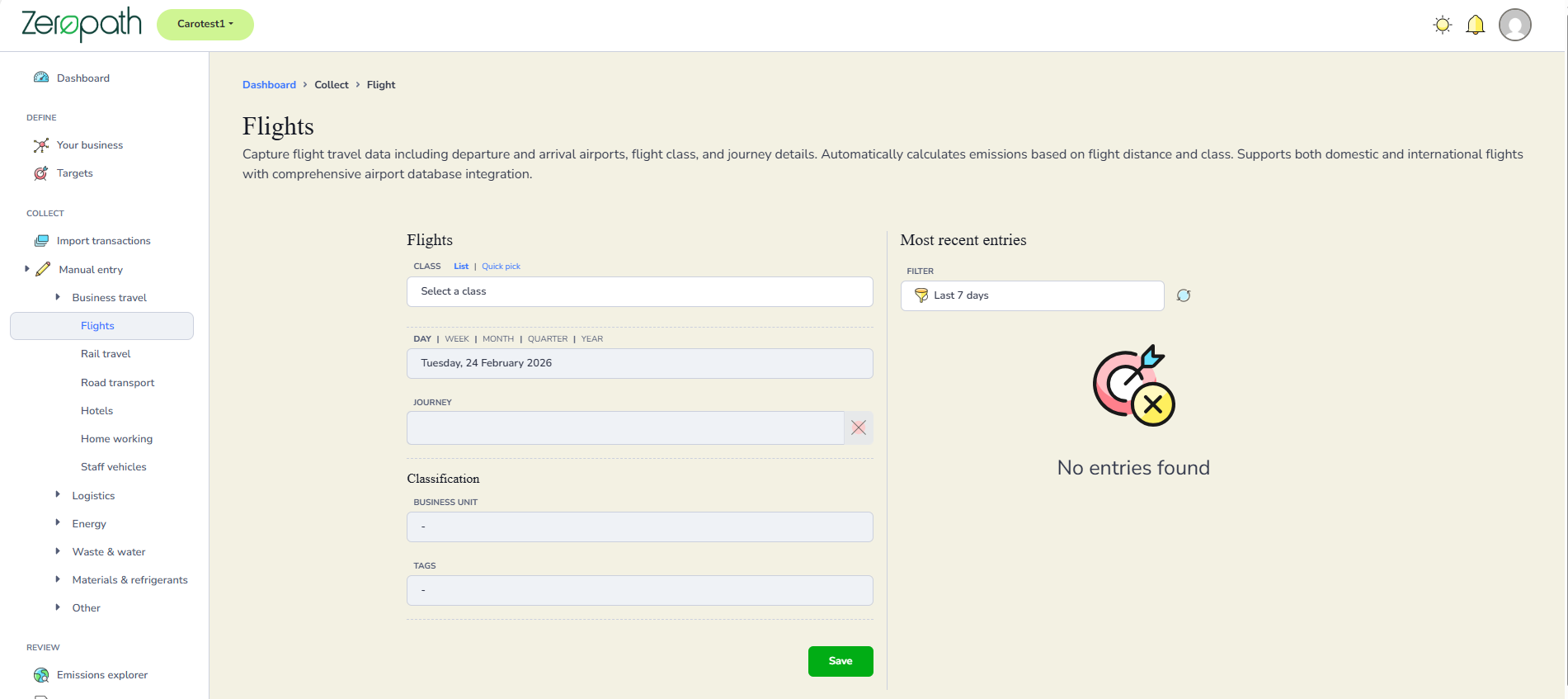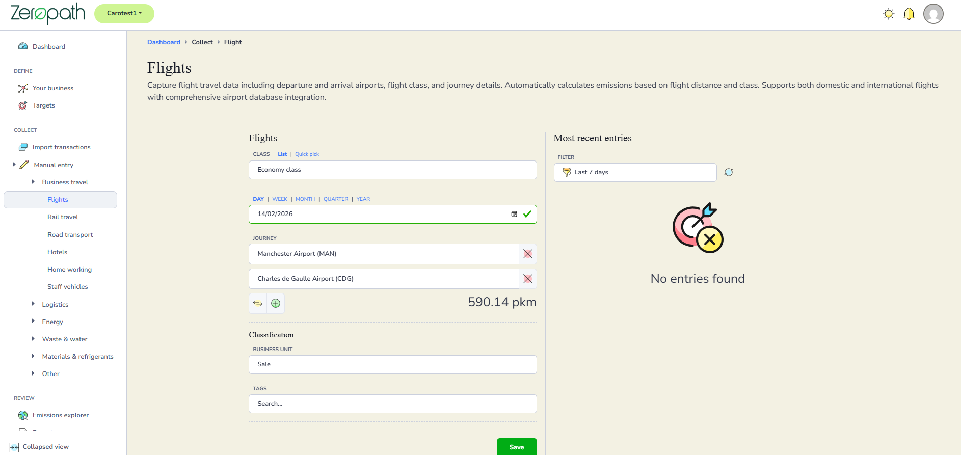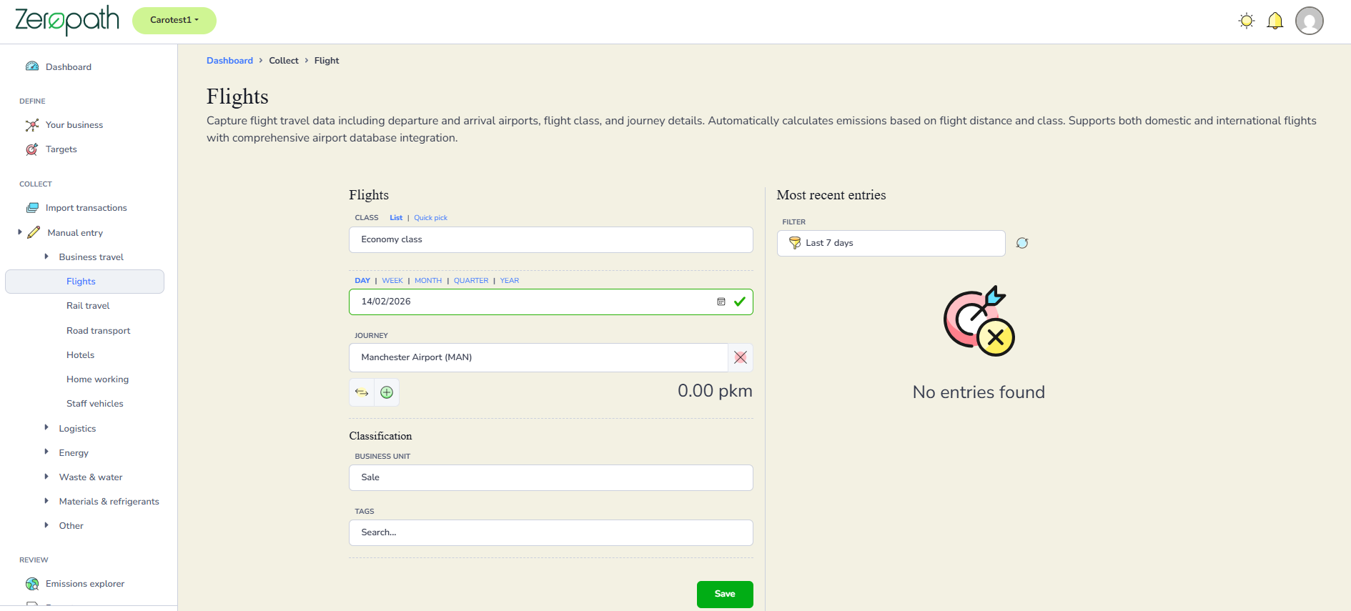 If you travel by air for business purposes, please record your flight details under Business Travel by selecting Flights and choosing the cabin class you travelled in. If you are entering historical data or are unsure which cabin class was used, please select Average Passenger.