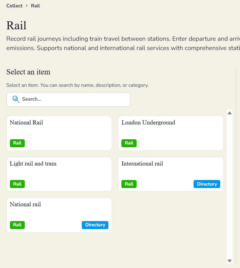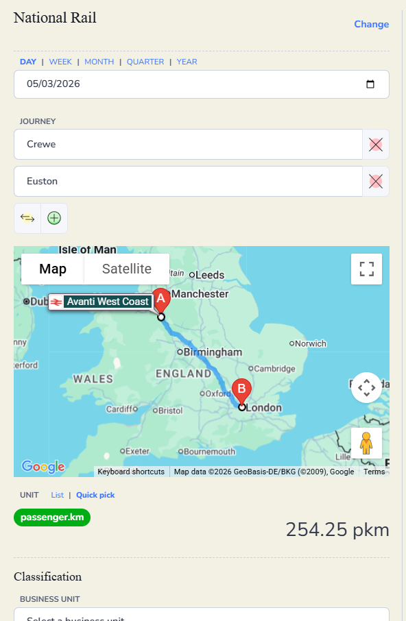 If you are travelling by rail for business purposes, you can add this by clicking on Manual Entry -> Business travel on the left-hand side of the dashboard. Then select rail travel and click on the rail service you used.