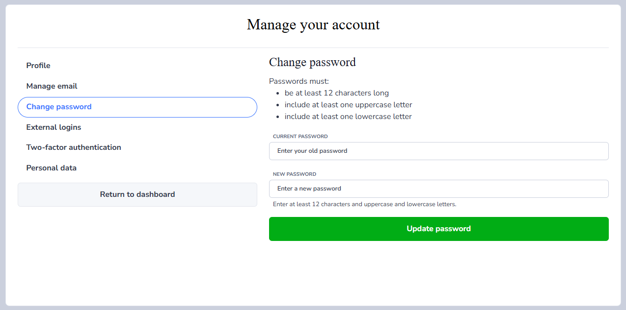 You will be directed to the Manage your account screen where you need to enter your current password and then add your new password and confirm this by entering it again and pressing the green Update password button.