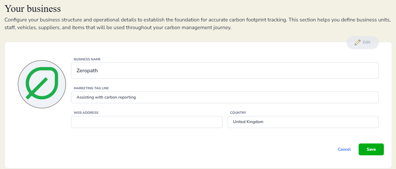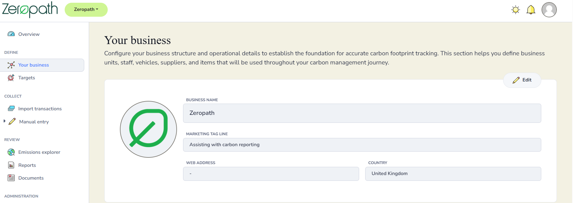 Your Business - Company Information Here you can start by setting up your company profile. Add your company name and any details you wish to include here and click done. This information can then be applied to documents generated by Zeropath.