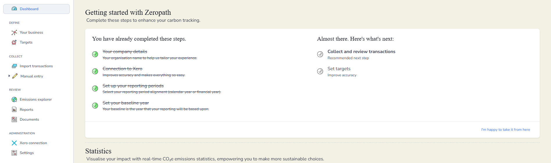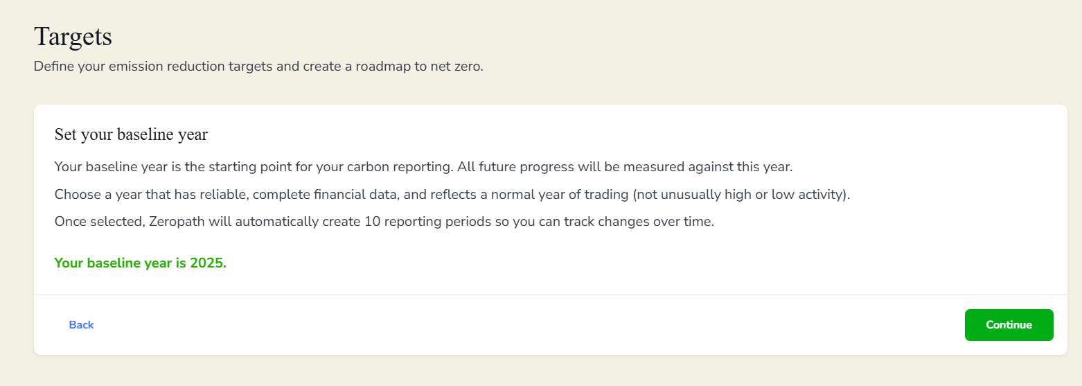 During the initial setup of your Zeropath account, you selected a baseline year for your carbon reporting. This screen confirms the year you chose.