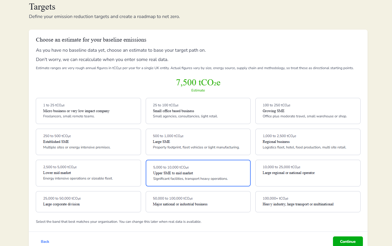 Select the emissions band that best reflects the size and operational footprint of your organisation. You can update this later once actual data has been entered, and your baseline will automatically recalculate.