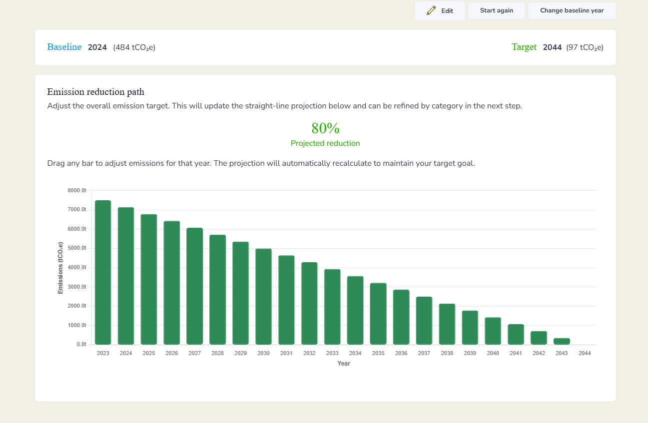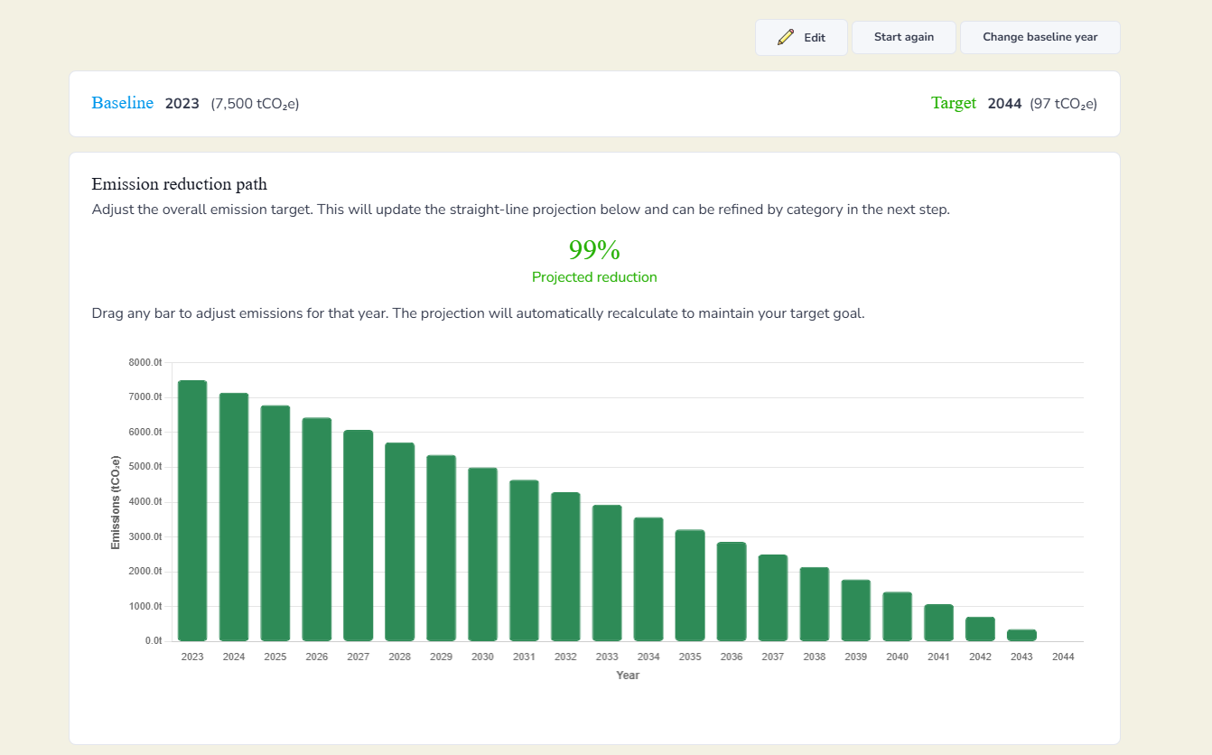 You will then see then see how you could achieve your net zero goal. You can move the bars accordingly to see how increasing or decreasing emissions on certain years will affect your timings. You can also set your final emissions percentage because 0 may not be practical for your industry, but the ability to get to 20% emissions would be.