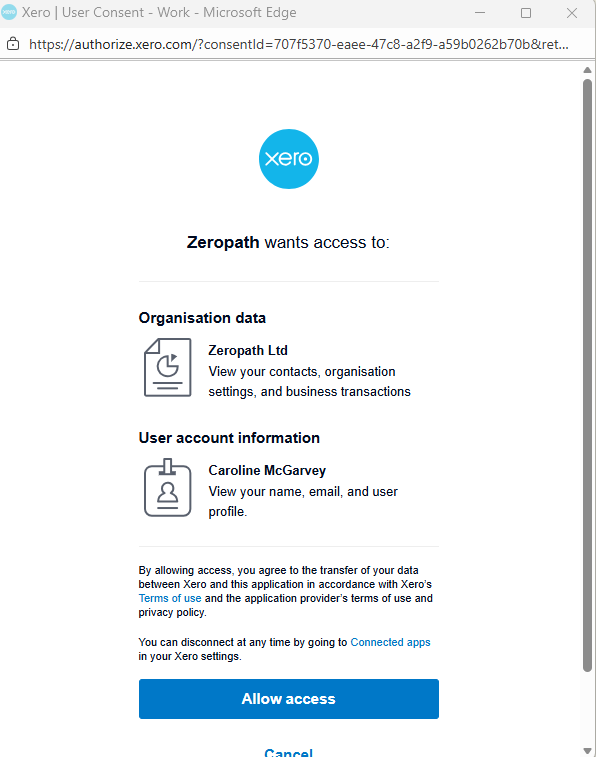 You will then see a screen to confirm Xero is connected to Zeropath.