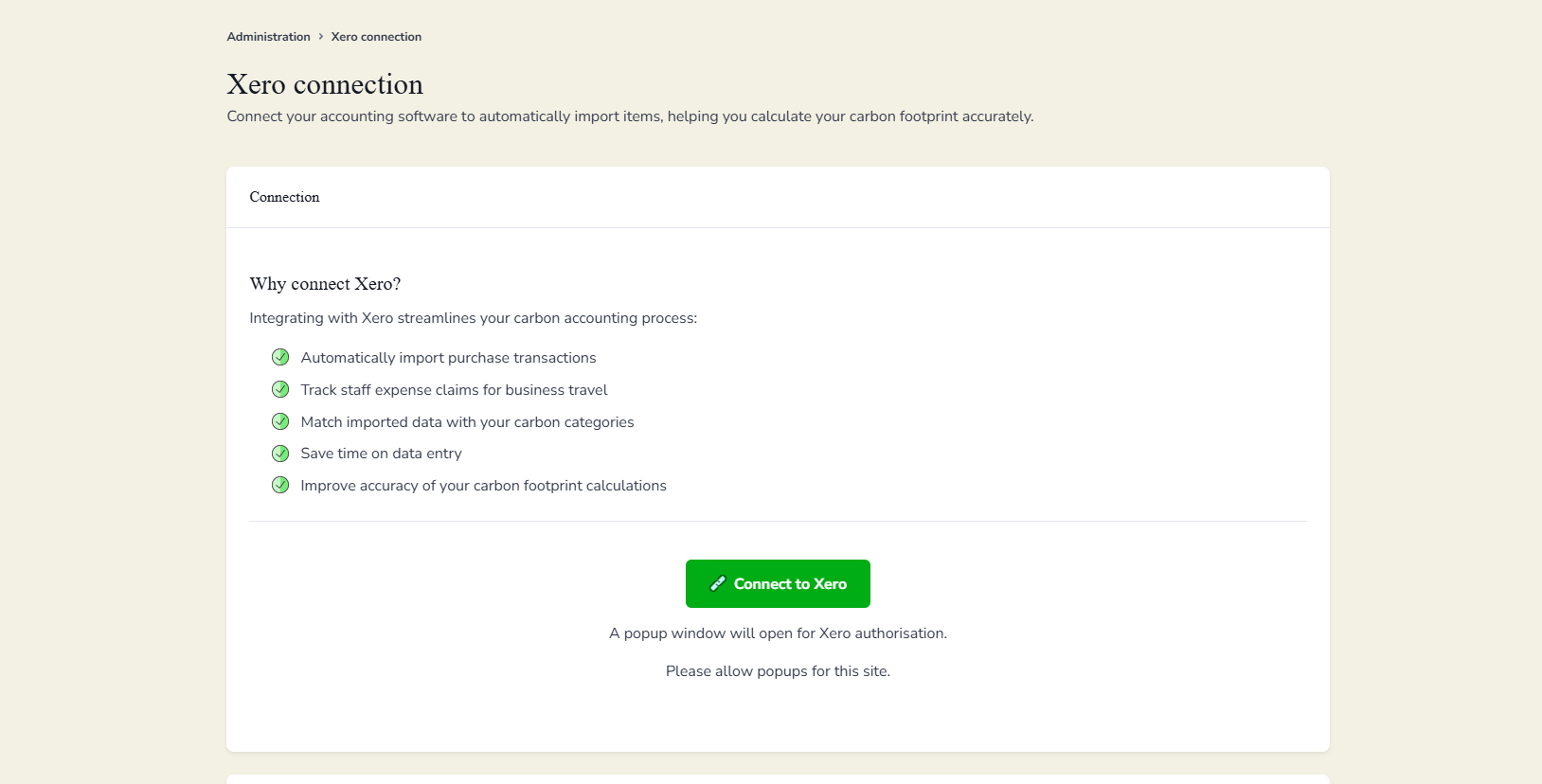 If you chose to skip the Xero connection during onboarding, you can connect to Xero at any time. Click on Settings under Administration in the left-hand menu and select Xero connection from the screen