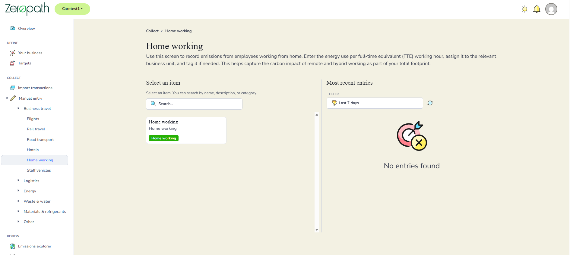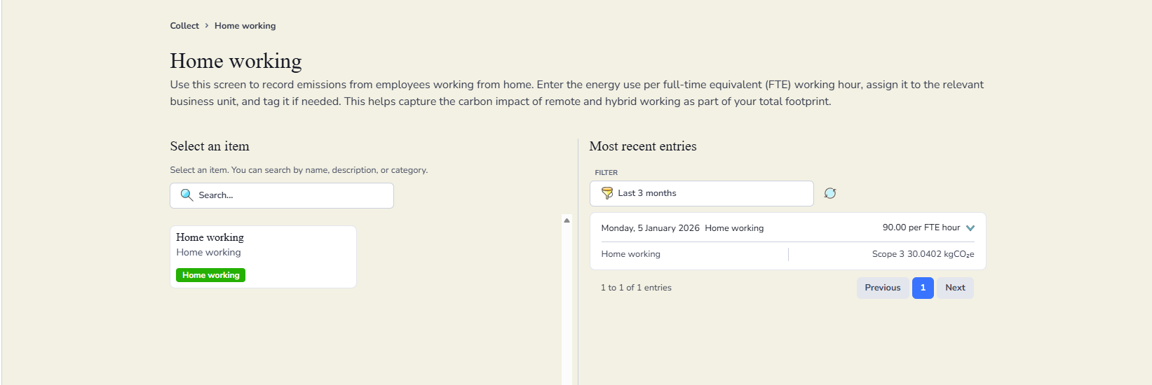 Use this screen to record emissions associated with employees working from home. This category covers energy and office equipment usage and has become more prevalent in recent years and people are working in a hybrid nature more. Often the figure is a conservative average of the number of members of staff, the number of days they are able to work from home, consider an average day length and allow for holidays / days visiting customers. Record the information in hours.