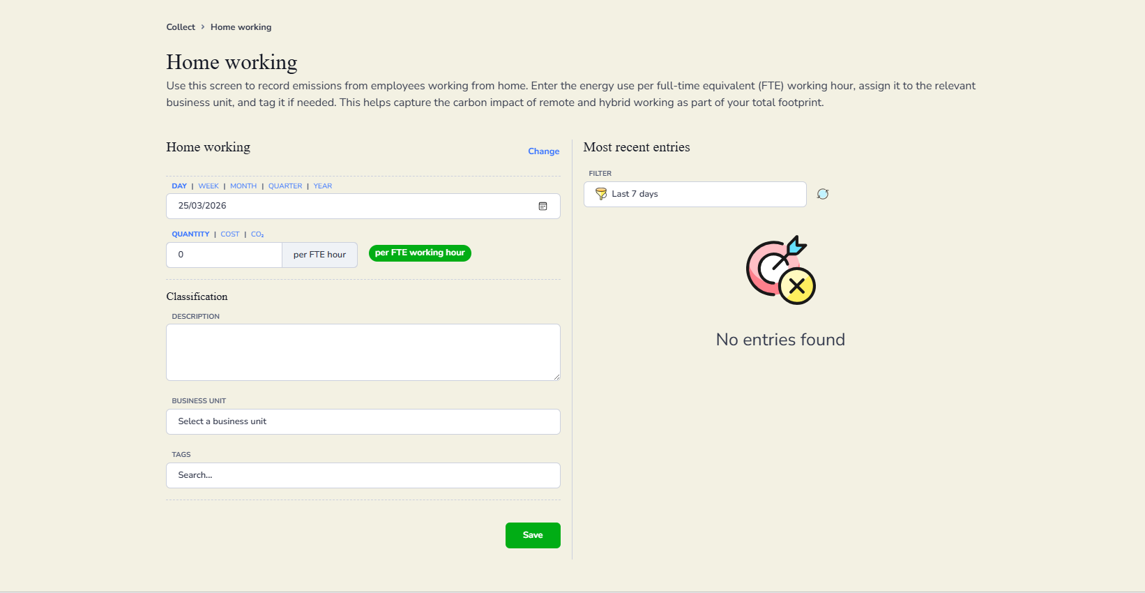 Select the period for which you are entering this data, for homeworking it can be done on a monthly or even annual basis. Enter the total number of hours to be captured, and assign them to the relevant business unit if required. You can also apply any applicable tags for reporting purposes. Then click Save.