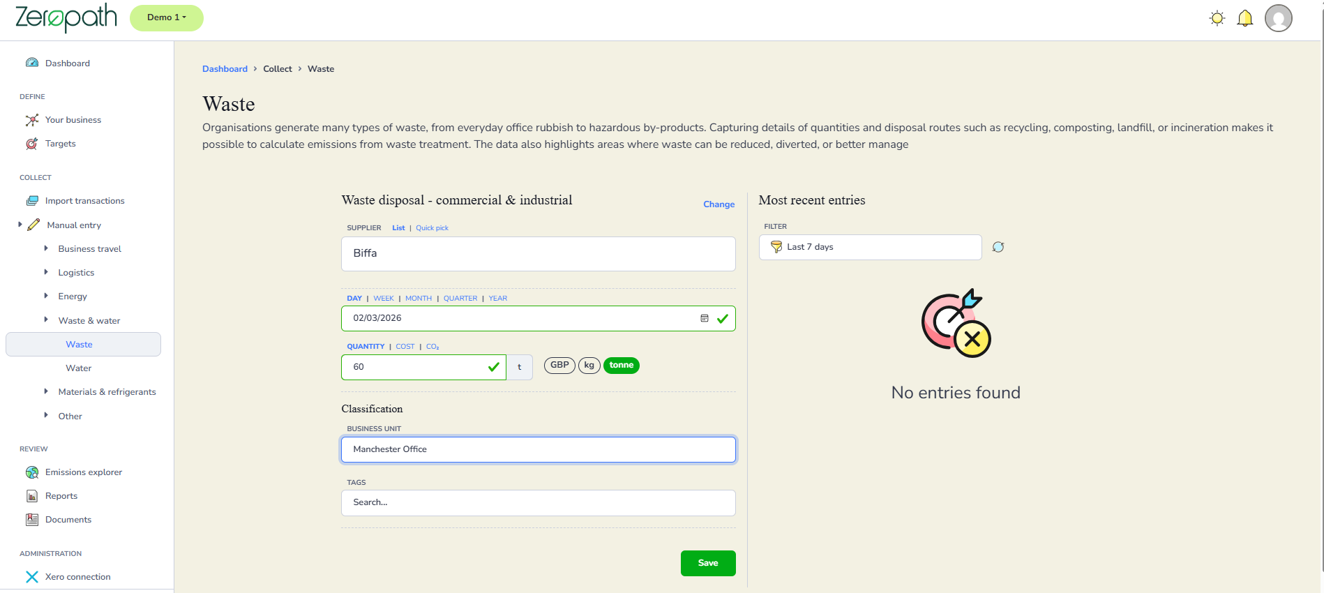 To record waste, navigate from the left-hand sidebar to Manual Entry, then select Waste and Water. Choose the item you want to attach the waste data to. If a supplier has been added, you can select them here.