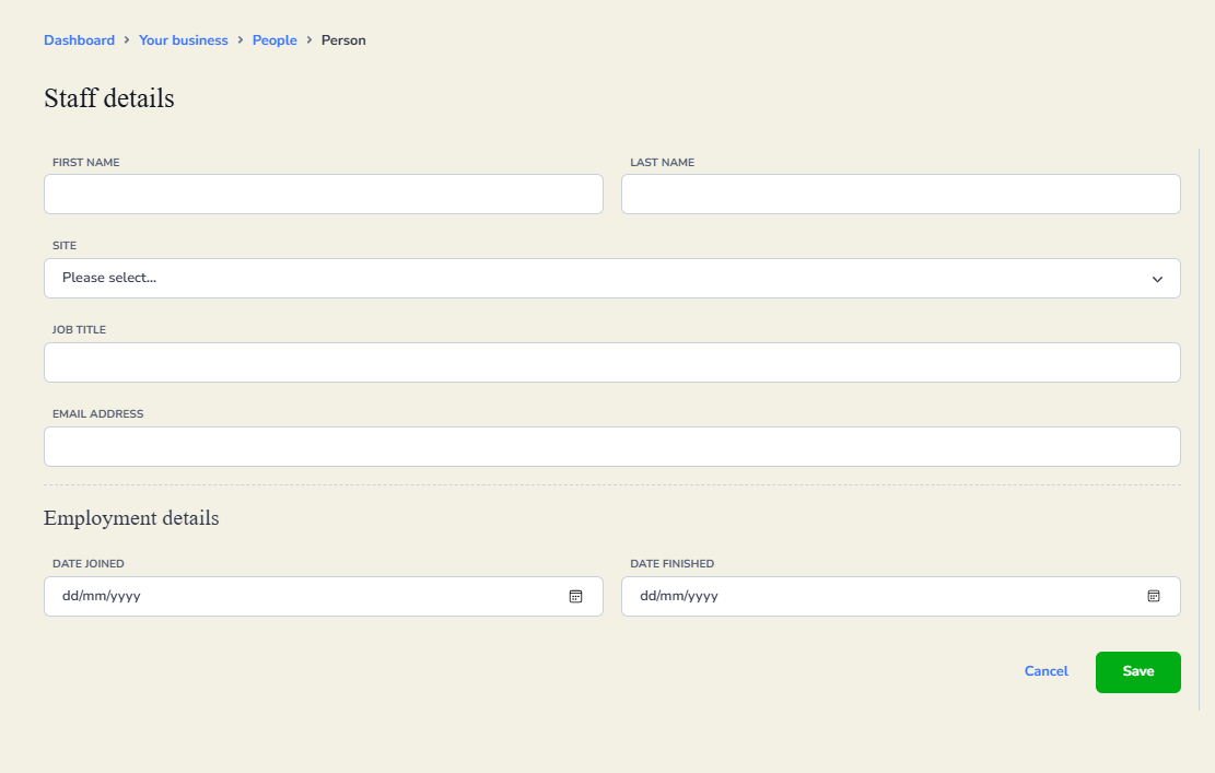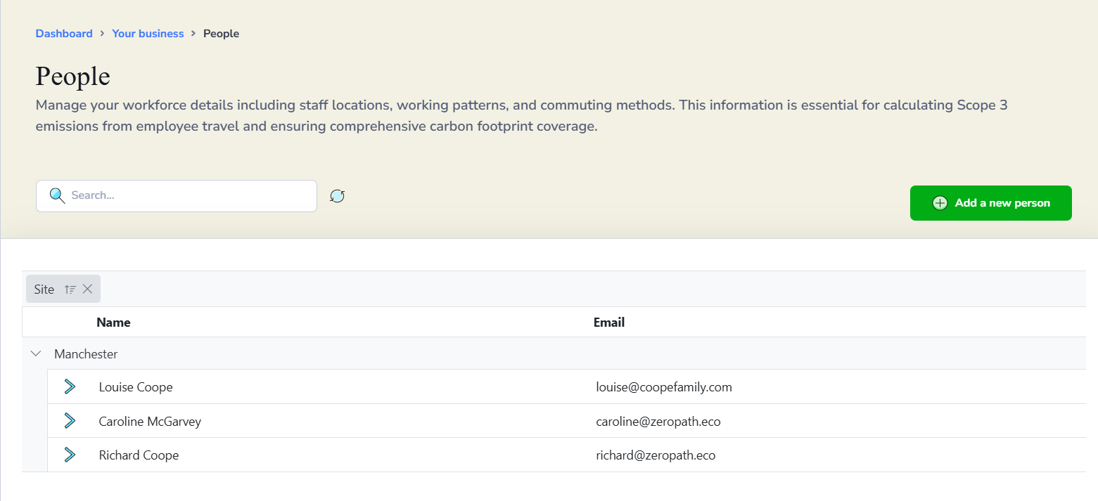 This section allows you to add the people who work within your organisation and may contribute to the organisation's carbon footprint, they may work from home which needs recording, or commute to an office location or have business expenses. Of course you do not have to enter your staff members, business expenses can be added anonymously through the business expenses screens.