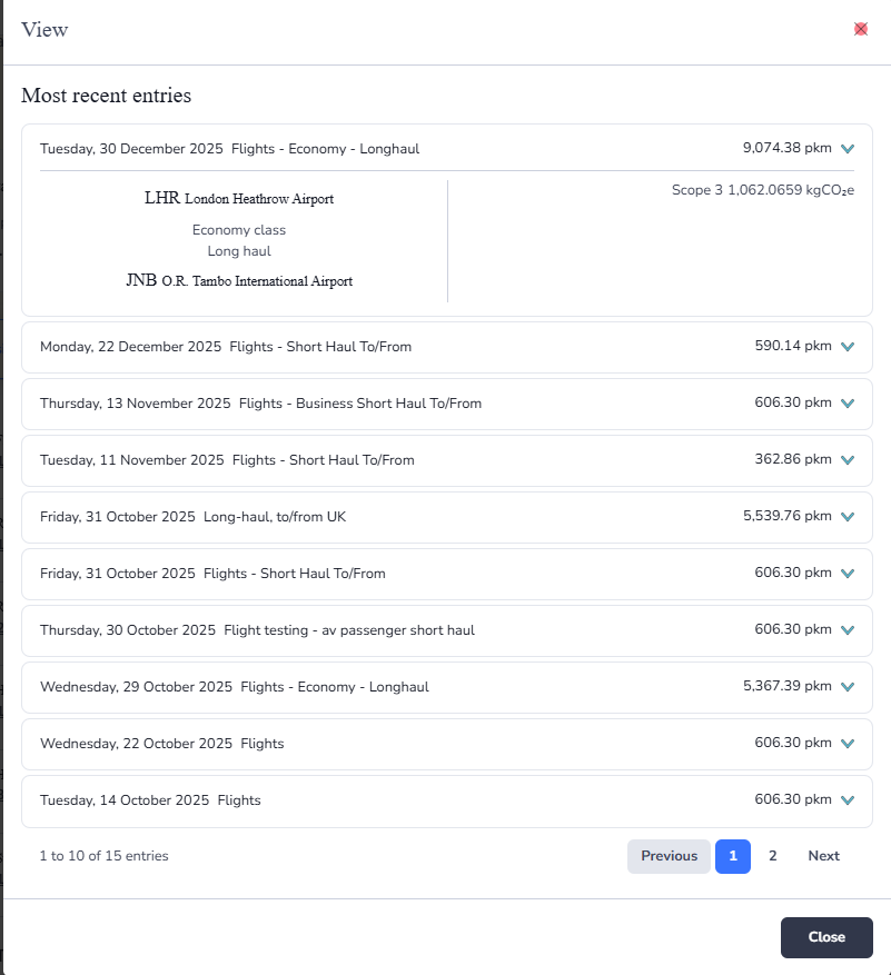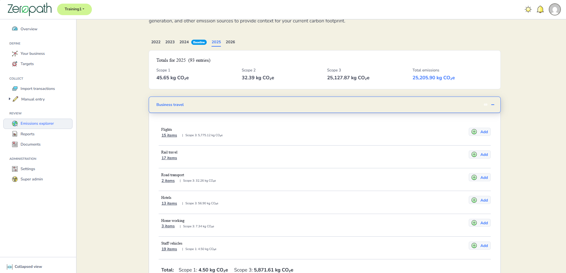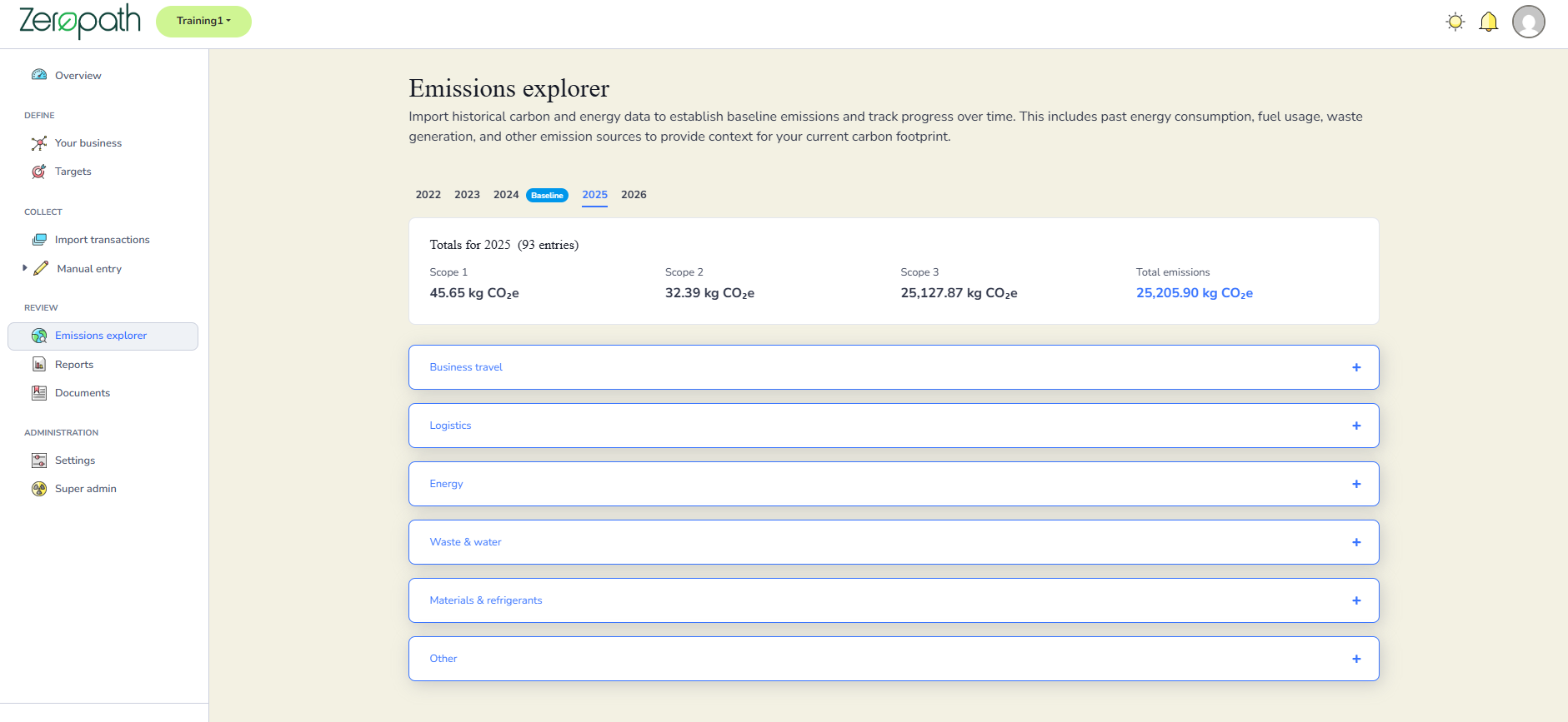 Use Emissions Explorer to view all entries and their carbon emissions. This may include past energy consumption, fuel use, waste generation, and other emission sources that help provide context for your current carbon footprint.